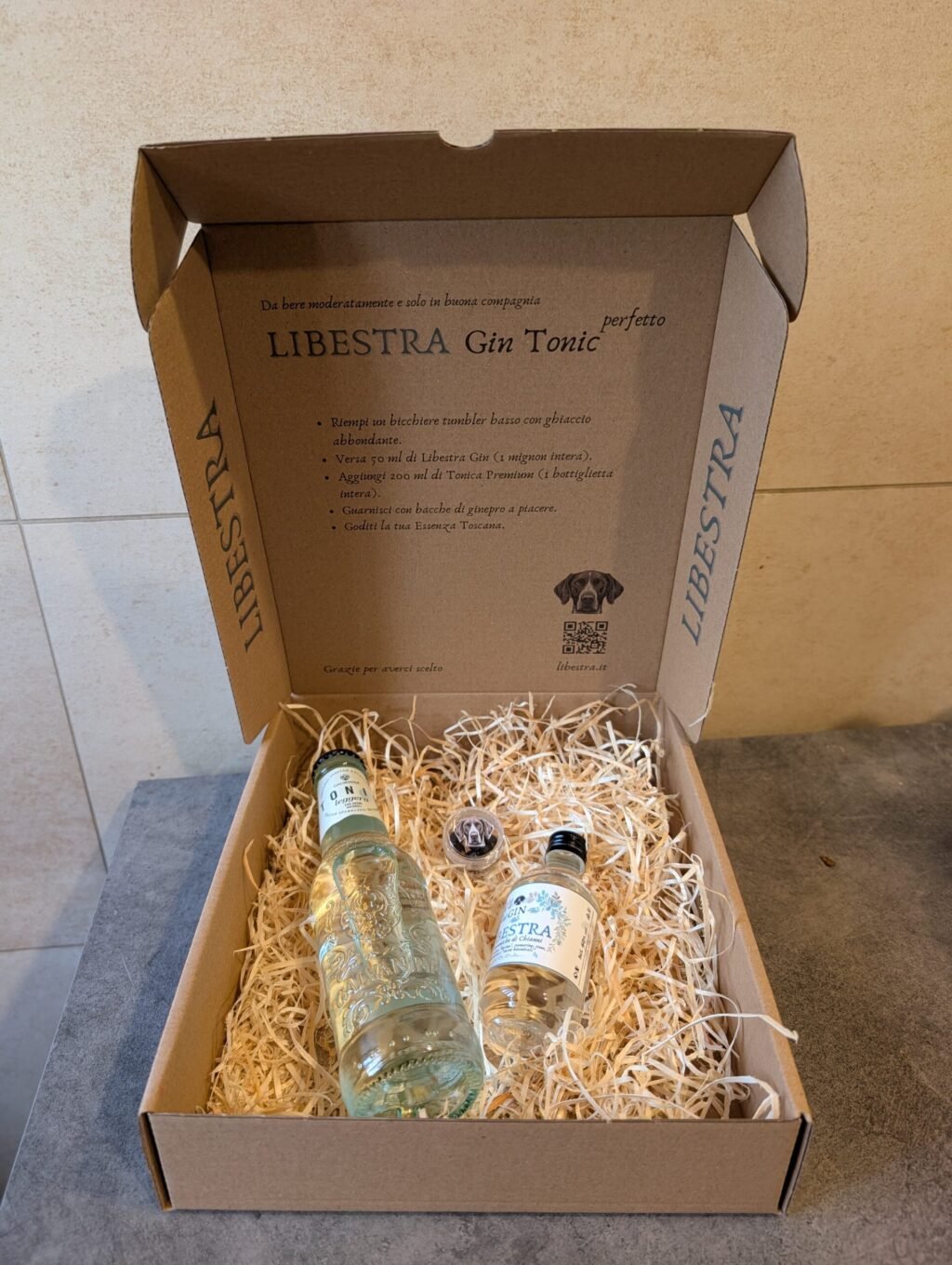 Scatola personalizzata con la tua ricetta, bacche di ginepro, una tonica galvanina bio ed una mignon da 50 ml di Libestra GIN. Il perfetto gin tonic, aggiungi ghiaccio e bevi in buona compagnia.
